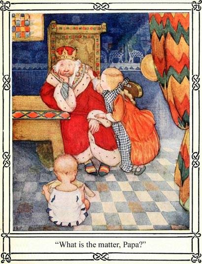 The King then sighed so heavily, and seemed so low-spirited, and sat down so miserably, leaning his head upon his hand, and his elbow upon the kitchen table pushed away in the corner, that the seventeen Princes and Princesses crept softly out of the kitchen, and left him alone with the Princess Alicia and the angelic baby.