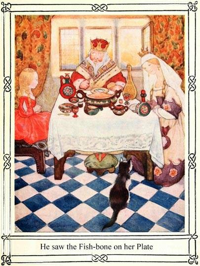 With those words, Grandmarina vanished, and the King went on and on and on, till he came to the office. There he wrote and wrote and wrote, till it was time to go home again. Then he politely invited the Princess Alicia, as the Fairy had directed him, to partake of the salmon. And when she had enjoyed it very much, he saw the fish-bone on her plate, as the Fairy had told him he would, and he delivered the Fairy’s message, and the Princess Alicia took care to dry the bone, and to rub it, and to polish it till it shone like mother-of-pearl.