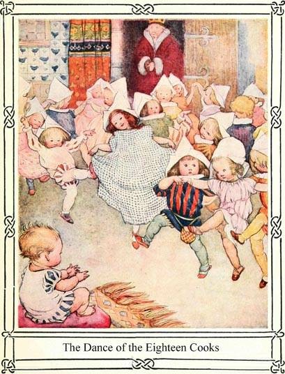 Well! and so another time the baby fell under the grate. The seventeen young Princes and Princesses were used to it, for they were almost always falling under the grate or down the stairs, but the baby was not used to it yet, and it gave him a swelled face and a black eye. The way the poor little darling came to tumble was, that he slid out of the Princess Alicia’s lap just as she was sitting in a great coarse apron that quite smothered her, in front of the kitchen-fire, beginning to peel the turnips for the broth for dinner; and the way she came to be doing that was, that the King’s cook had run away that morning with her own true love who was a very tall but very tipsy soldier. Then, the seventeen young Princes and Princesses, who cried at everything that happened, cried and roared. But the Princess Alicia (who couldn’t help crying a little herself) quietly called to them to be still, on account of not throwing back the Queen up-stairs, who was fast getting well, and said, “Hold your tongues, you wicked little monkeys, every one of you, while I examine baby!” Then she examined baby, and found that he hadn’t broken anything, and she held cold iron to his poor dear eye, and smoothed his poor dear face, and he presently fell asleep in her arms. Then, she said to the seventeen Princes and Princesses, “I am afraid to lay him down yet, lest he should wake and feel pain, be good, and you shall all be cooks.” They jumped for joy when they heard that, and began making themselves cooks’ caps out of old newspapers. So to one she gave the salt-box, and to one she gave the barley, and to one she gave the herbs, and to one she gave the turnips, and to one she gave the carrots, and to one she gave the onions, and to one she gave the spice-box, till they were all cooks, and all running about at work, she sitting in the middle smothered in the great coarse apron, nursing baby. By and by the broth was done, and the baby woke up smiling like an angel, and was trusted to the sedatest Princess to hold, while the other Princes and Princesses were squeezed into a far-off corner to look at the Princess Alicia turning out the saucepan-full of broth, for fear (as they were always getting into trouble) they should get splashed and scalded. When the broth came tumbling out, steaming beautifully, and smelling like a nosegay good to eat, they clapped their hands. That made the baby clap his hands; and that, and his looking as if he had a comic toothache, made all the Princes and Princesses laugh. So the Princess Alicia said, “Laugh and be good, and after dinner we will make him a nest on the floor in a corner, and he shall sit in his nest and see a dance of eighteen cooks.” That delighted the young Princes and Princesses, and they ate up all the broth, and washed up all the plates and dishes, and cleared away, and pushed the table into a corner, and then they in their cooks’ caps, and the Princess Alicia in the smothering coarse apron that belonged to the cook that had run away with her own true love that was the very tall but very tipsy soldier, danced a dance of eighteen cooks before the angelic baby, who forgot his swelled face and his black eye, and crowed with joy.