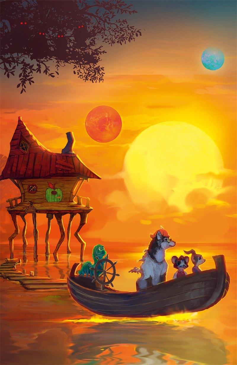 Мышата плыли на закате на моторной лодке Личинкинса. Но, к сожалению, тогда они были так заняты своими мыслями, что не заметили злобных голубей-стервятников, а те прятались на деревьях и шпионили за ними.