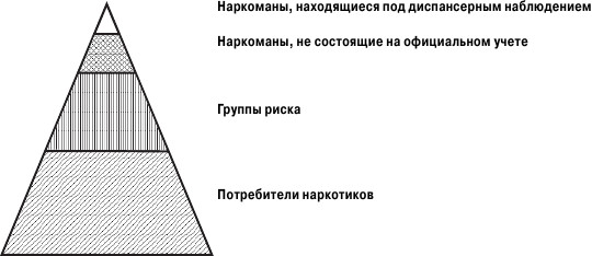 Постановка наркомана на учет, отбывание наказания за торговлю наркотиками – это финальные стадии соответствующих «карьер». Начинается все с групп риска, первых проб наркотиков или попыток заработать на незаконных операциях с наркотиками. Эти «первичные» группы, как свидетельствуют статистика, социологические измерения и наблюдения, гораздо шире, объемнее, чем «финальные», «верхушечные» группы, что и дает нам право использовать пример пирамиды (рис. 1).