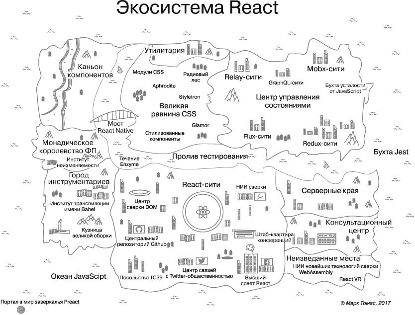 Рис. 1.2. Карта экосистемы React разноплановая настолько, что даже не вписывается в мои представления. Если вы хотите получить дополнительную информацию, я опубликовал на сайте ifelse.io/react-ecosystem руководство, которое поможет определить свой путь в экосистеме React