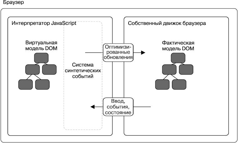 Рис. 1.3. Фактическая и виртуальная DOM. Виртуальная DOM в React обрабатывает изменения в данных, а также преобразование событий браузера в события, которые компоненты могут воспринять и на которые могут среагировать. Виртуальная DOM в React нацелена также на оптимизацию изменений, внесенных в DOM ради производительности