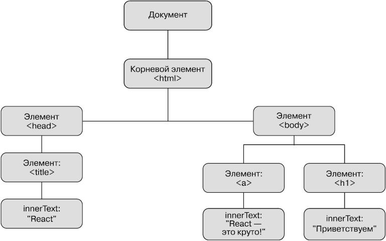 Рис. 1.4. Простая версия структуры дерева DOM, в которой используются элементы, вероятно, вам знакомые. Интерфейс DOM API, который применяется JavaScript, позволяет выполнять операции над этими элементами в дереве