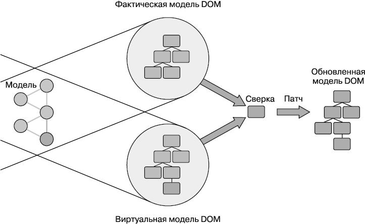 Рис. 1.5. Процедура обновления и учета изменений в React. Когда происходит изменение, React определяет различия между фактическими и внутренними объектами DOM. Затем библиотека эффективно обновляет DOM браузера. Этот процесс часто называют сверкой («что изменилось?») или патчем («обновлять только то, что изменилось»)