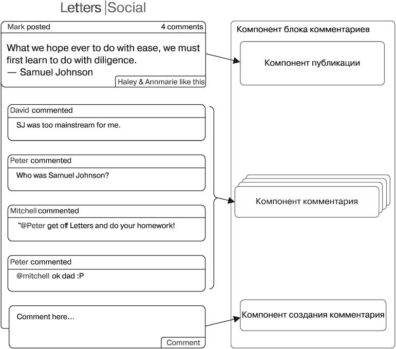 | Упражнение 1.1. Разберитесь с компонентами Посетите популярный сайт, который вам нравится (например, GitHub), и разделите его интерфейс на компоненты. В процессе этого вы, вероятно, обнаружите, что дробите его на все более мелкие части. Когда нужно остановиться? Должно ли отдельное сообщение быть компонентом? Когда имеет смысл использовать мелкие компоненты? Когда целесообразно рассматривать группу элементов как один компонент? |