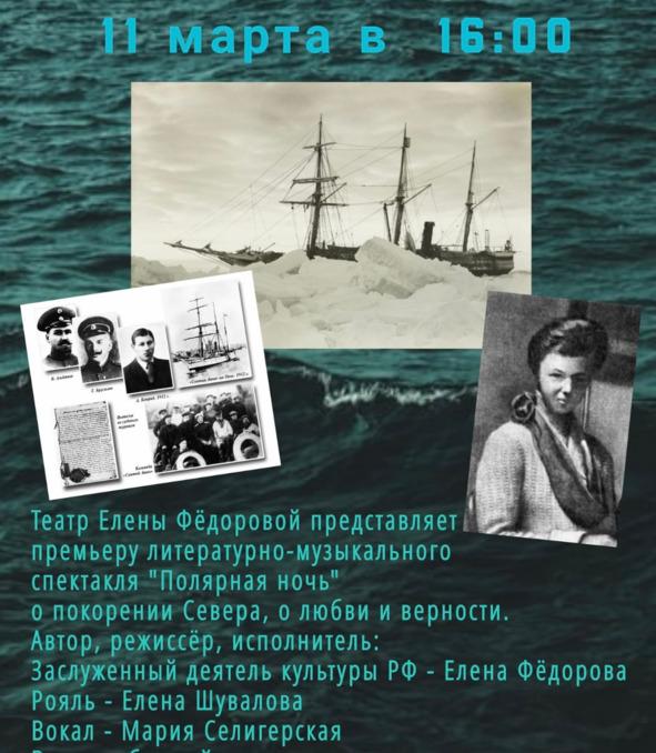 Музыкально-поэтический спектакль о покорении северных широт, о мужестве, любви и верности. О первой и пока единственная в мире высокоширотной зимовщице Ерминии Жданко, исчезнувшей во льдах Арктики в 1914 году…