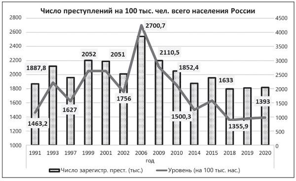 Диаграмма 1. Изменение уровня преступности на 100 тыс. населения в период 1991–2020 гг. на фоне числа зарегистрированных преступлений 27