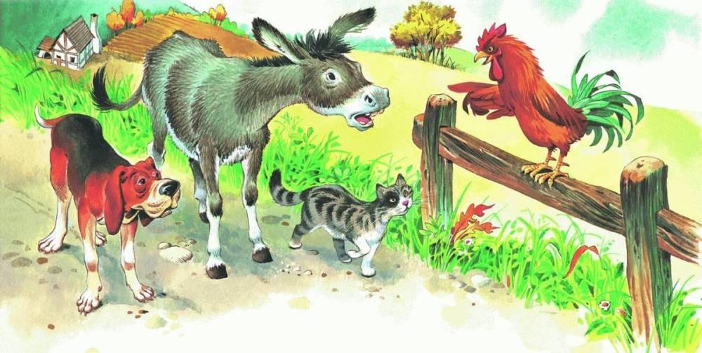 Собака охотно согласилась. А ещё, немного погодя, к ним присоединился бродячий кот, который уже давно разучился ловить мышей, так как был очень стар. Шли они, шли и дошли до какой-то фермы. На её ограде сидел петух, который так звонко распевал своё «кукареку», что осёл, собака и кот заслушались.