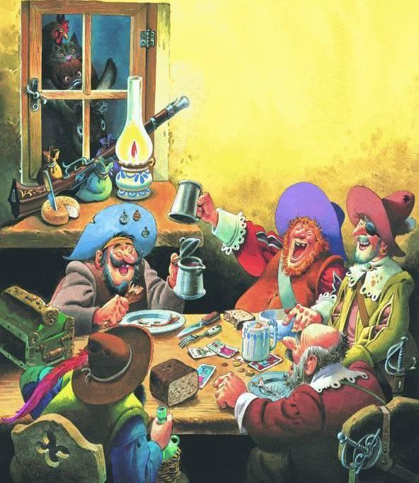 А четверо друзей уселись за стол и устроили настоящий пир. Но когда они улеглись спать, один из разбойников прокрался в дом, чтобы проверить: не ушёл ли дьявол?