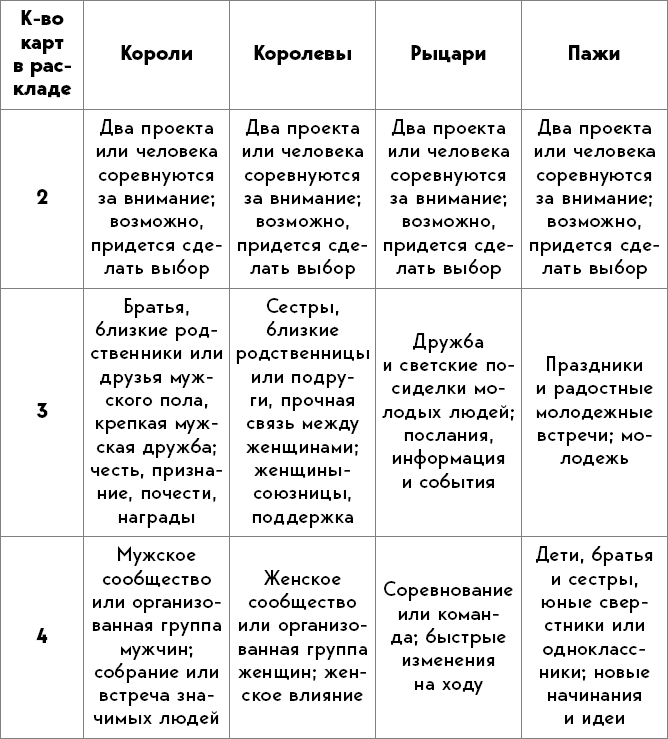 Придворные карты могут представлять людей или относиться к ситуации, окружающим энергиям и влияниям, сторонам личности и событиям. Вы поймете, что́ именно отображают карты, если сопоставите их значения с заданным вопросом и обстоятельствами. Например, три королевы в раскладе, связанном с духовным аспектом, могут указывать на поддержку проводников, предков или божественных союзников. Также полезно обратить внимание на масти, которые появляются в раскладе (см. табл. 1). Если вы получили Королеву мечей и Королеву кубков, это может указывать либо на баланс, либо на конфликт между умом и сердцем. Более точное толкование зависит от других карт в раскладе, заданного вопроса и кверента. В конечном счете ваша интуиция – самый мощный инструмент интерпретации смысла.