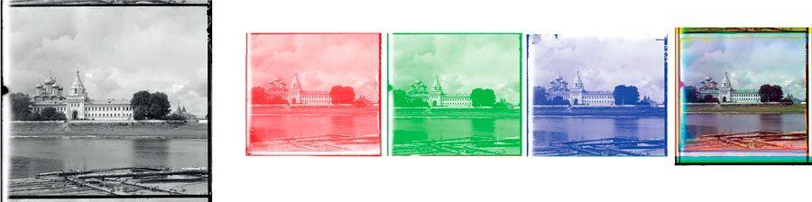 «Принцип цветной фотографии, разработанный Сергеем Михайловичем, состоял в следующем: на одном продолговатом стеклянном черно-белом негативе, чувствительном ко всем цветам спектра, изготовленном по его собственному патенту, он делал своей камерой три одинаковых снимка с одного и того же объекта.