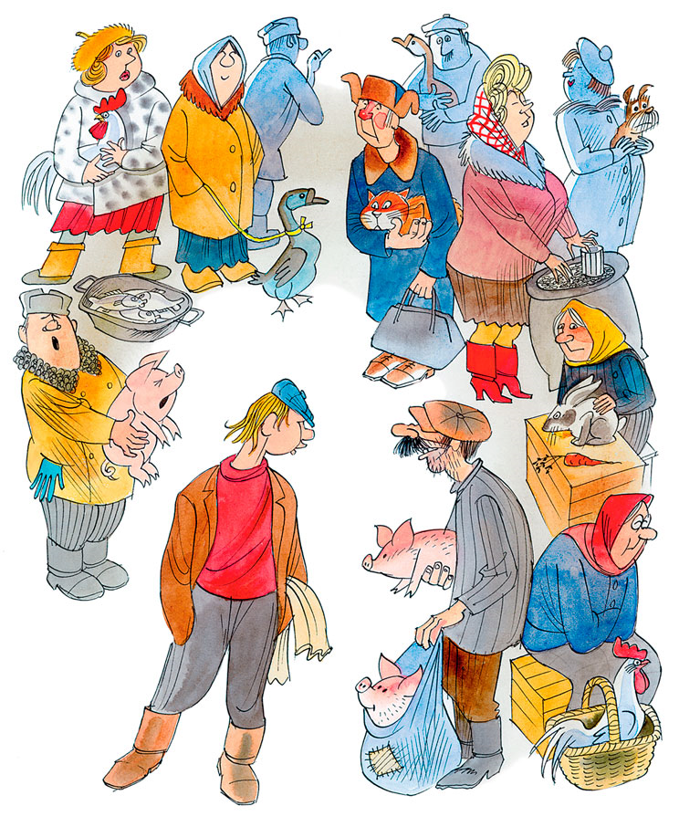 В самом углу рынка, под башней, Вася увидел, что искал. Здесь продавали кур, гусей, телят – всякую живность. И поросят было много.