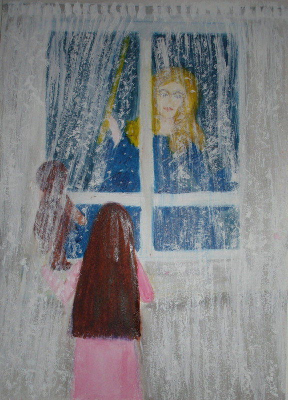 В доме все пошли спать и выключили свет. Маленькая девочка, лёжа в своей кроватке, замёрзла. Холодная постель не давала малышке уснуть. Она приподняла голову и посмотрела в окно. На улице, усыпляя природу, шёл снег. Крупн