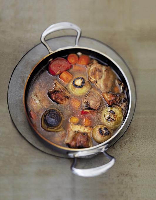 > Очистите противень от жира и дегласируйте 1 полным стаканом воды. Полученный сок перелейте в кастрюлю. Добавьте 1 ст. л. томатной пасты, 4 помидора дольками, морковь и сельдерей. Поджаривайте на сильном огне 5 минут. Залейте холодной водой, добавьте 1 букет гарни. Доведите до кипения, затем варите без крышки при слабом кипении еще 4 часа, постоянно снимая пену.