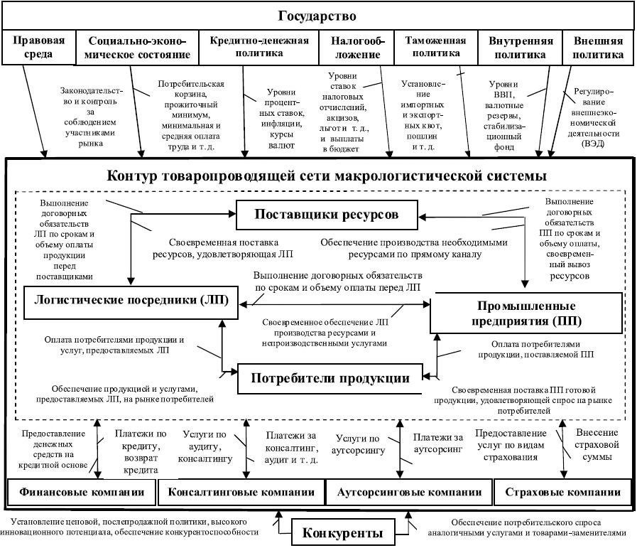 4) движение ресурсов (продукции и услуг). Пример общей схемы функционирования товаропроводящей сети с учетом комплекса внешних и внутренних факторов макрологистической системы приведен на рис. 14.3.