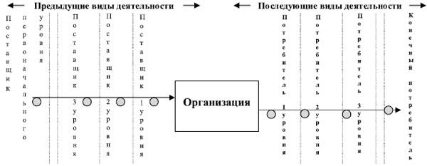Основные виды деятельности в цепи поставок продукции по определенным уровням приведены на условной схеме рис. 14.4. На входе и выходе предпринимательской организации в приведенной схеме условно ранжированы по четырем уровням предыдущие и последующие виды деятельности, включая поставщика первоначального уровня и конкретного конечного потребителя.