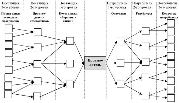 Условная цепь поставок (товаропроводящая сеть), которая на любом уровне может быть сформирована вокруг производителя на входе и выходе организации, представлена на рис. 14.5.