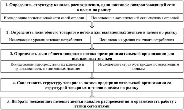Правильный выбор, оптимизация структуры каналов распределения, цепей поставок товаропроводящей сети и управление ею — первостепенные задачи систем стратегического менеджмента предпринимательских организаций. Схема, отражающая основные, необходимые этапы и элементы построения структуры каналов распределения цепей поставок товаропроводящей сети, приведена на рис. 14.7.