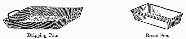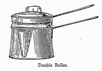 There are two modes of frying. One is to have just enough fat to prevent the article from burning or sticking; and the other is to have enough not only to cover the food, but to float it. The latter is by far the better way, as all the surface of the article is instantly hardened, and, therefore, will not absorb fat. It is also the cheaper way, because the fat can be used so many times. If the drippings saved from meats, soups and gravies should not be enough for frying purposes, buy pure lard to use with it. Many recommend buying beef suet for this same purpose; but food fried in suet is more liable to absorb fat than that fried in lard. The reason of this is that lard can be heated to a higher temperature without burning than can beef or any of the other fats. Butter is also often recommended for frying. If used, it should be free of salt. But aside from being so expensive, it is not so nice for frying purposes as fats, for it burns at a much lower temperature than either beef fat or lard. The Scotch kettle is the best utensil for frying. It rests on a rim, which lifts the bottom from the stove, and the inside surface is polished very smooth; therefore, the fat is less liable to burn than if the surface were rough and the bottom rested on the hot stove. The fat should heat gradually; and when the food is plunged into it a slight smoke should rise from the centre. It will smoke at the sides some time before it has become hot enough for frying. After the food has been put in, let the kettle stand on the hottest part of the stove until it regains its former temperature, and then set it back where it is not quite so hot. In frying fish-balls, doughnuts, etc., put only a few at a time in the boiling fat; then wait a few moments for the fat to regain its former temperature, and put in a few more. Fish-balls are often spoiled by the putting of a great many in the kettle at once. The temperature of the fat is instantly reduced, and the balls absorb the fat. When an article of food is fried, drain the fat from it, and lay it on a sheet of brown paper in a warm pan. The paper will absorb any fat that may remain on the food. As soon as you are through frying, take the fat from the fire, and when cooled a little, strain it, (See the chapter on the Care of Food.) If the directions given are followed, there will be no difficulty in having food fried without its being saturated with grease.
