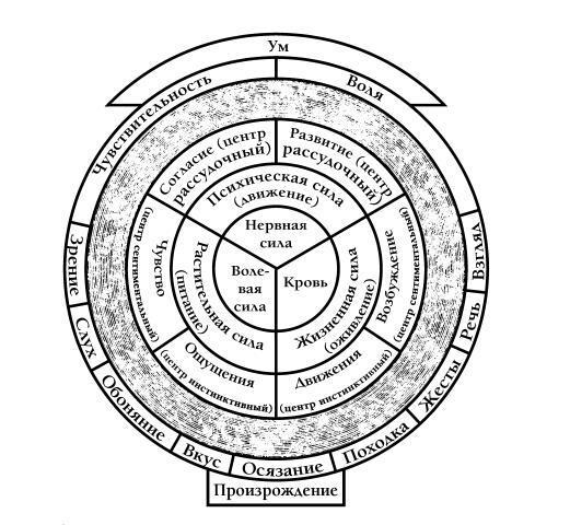 Материальная часть человека состоит из клеточек, группирующихся в органы; из органов составляются системы; совокупность систем представляет человека-машину, отвечающего трем главным целям.