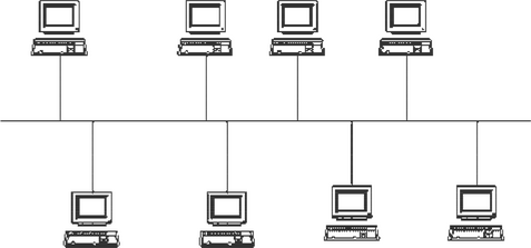 Топология «шина» (или, как ее еще называют, общая шина) является наиболее простой и широко распространенной из всех видов топологий (рис. 1.1). Она имеет линейную конфигурацию, при которой все компьютеры соединены параллельно одним кабелем, именуемым магистралью или сегментом. Данные в виде электрических сигналов передаются всем компьютерам сети; однако информацию принимает только тот, адрес которого соответствует адресу получателя. Но, так как данные распространяются по всей сети, если не предпринимать никаких специальных действий, сигнал, достигая конца кабеля, будет отражаться и не позволит другим компьютерам осуществлять передачу. Чтобы предотвратить эффект отражения сигналов, к концам кабеля подключают терминаторы, поглощающие эти сигналы. Передавать данные одномоментно может только один компьютер, поэтому чем больше компьютеров в сети, тем меньше его пропускная способность.