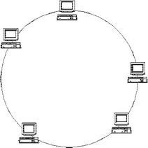 При топологии «кольцо» компьютеры подключаются к кабелю, замкнутому в кольцо (рис. 1.3). Сигналы предаются по кольцу в одном направлении. В этом случае данные передаются от одного компьютера к другому как бы по эстафете. Если компьютер получит данные, предназначенные для другого компьютера, он передает их дальше по кольцу. Если данные предназначены для получившего их компьютера, они дальше не передаются. «Кольцо» – это активная топология. Здесь каждый компьютер выступает в роли репитера, передавая сигналы следующему компьютеру.