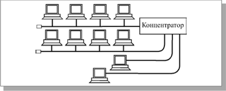 • если выйдет из строя только один компьютер (или кабель, соединяющий его с концентратором), то лишь этот компьютер не сможет передавать или принимать данные по сети;