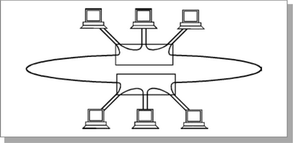 В случае звездно-кольцевой (star-ring) топологии в кольцо объединяются не сами компьютеры, а специальные концентраторы (изображенные на рис. 1.9 в виде прямоугольников), к которым в свою очередь подключаются компьютеры с помощью звездообразных двойных линий связи. В действительности все компьютеры сети включаются в замкнутое кольцо, так как внутри концентраторов линии связи образуют замкнутый контур (как показано на рис. 1.9). Данная топология дает возможность комбинировать преимущества звездной и кольцевой топологий. Например, концентраторы позволяют собрать в одно место все точки подключения кабелей сети. Если говорить о распространении информации, данная топология равноценна классическому кольцу.