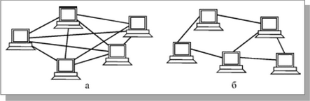 Рис. 1.10. Сеточная топология: полная (а) и частичная (б)