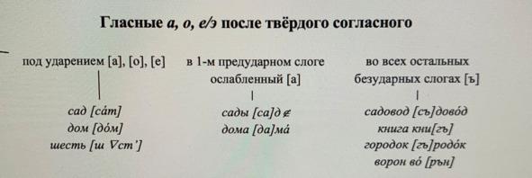 Гласные под ударением произносятся отчётливо (сáд, дóм, шéсть, сýк, дÏ м, úл), а в безударном положении — менее отчётливо, ослабленно, что создает орфографические трудности. Произношение безударного гласного звука зависит не только от положения слога по отношению к ударению, но и от того, стоит ли безударный гласный звук после твёрдого или мягкого согласного.