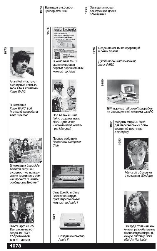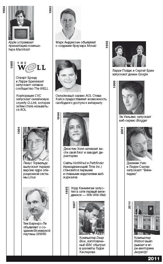 Интернет первоначально создавался для того, чтобы облегчить сотрудничество. Напротив, персональные компьютеры, особенно те, которые предназначены для использования в домашних условиях, были разработаны в качестве инструментов для индивидуального творчества. Более десяти лет, с начала 1970-х годов, развитие сетей и домашних компьютеров происходило независимо друг от друга. К концу 1980-х годов, с появлением модемов, онлайн-сервисов и всемирной сети, эти направления, наконец, сошлись. Так же как объединение парового двигателя с хитроумными механизмами привело к промышленной революции, сочетание компьютера и распределенных сетей привело к цифровой революции, что позволило любому пользователю создавать, распространять и получать любую информацию в любом месте.