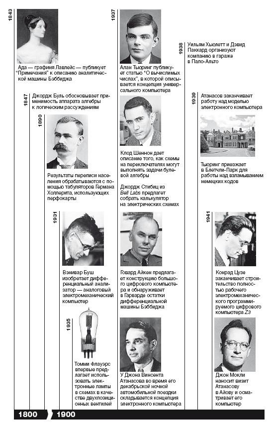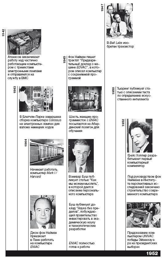 В случае с компьютерами тоже было много сделано подобных мелких шагов, с помощью которых безымянные инженеры из таких фирм, как IBM, продвинули вперед технологию. Но этого было недостаточно. Хотя машины, производимые корпорацией IBM в начале ХХ века, могли компилировать данные, они не являлись в полном смысле тем, что мы назвали бы компьютером. Они даже не были особо эффективными калькуляторами. Они все-таки были недоделанными устройствами. Кроме сотен мелких достижений, для рождения компьютерной эры потребовалось и несколько крупных прорывов, совершенных гениями-творцами.