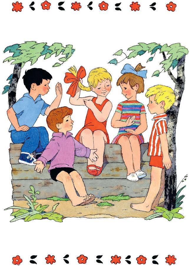 Ребята сидели на брёвнышках под берёзами и разговаривали.