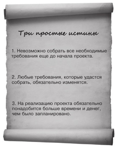 Принимая первую истину, мы перестаем бояться предстоящего проекта, который еще не известен нам во всех деталях. Мы понимаем, что требования еще предстоит разузнать и что работу вполне можно начинать еще до окончания сбора всей информации.