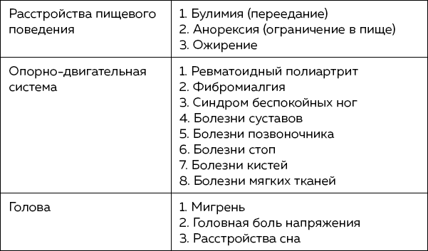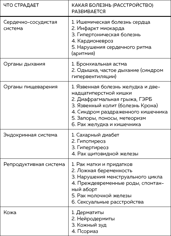 Психосоматическое заболевание (расстройство) – это реакция на эмоциональное переживание (острый или хронический психический стресс) [3], сопровождающаяся сначала расстройством функции какого-либо органа или системы человека, а потом и развитием тяжелого органического поражения. Какие и сколько органов или систем станут мишенью для такого поражения, определить трудно – на это может влиять индивидуальная предрасположенность человека. Я занимаюсь исключительно лечением заболеваний опорно-двигательной системы, поэтому не стану подробно описывать здесь механизмы развития психосоматических расстройств в других органах и системах в ответ на острый или хронический стресс, а только лишь перечислю эти расстройства и болезни, чтобы читатель мог иметь представление об их многообразии.