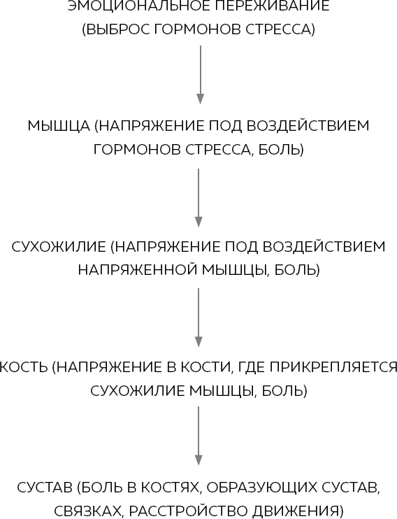 Мышцы при помощи сухожилий прикрепляются к костям, включая позвоночник, в том числе костям, образующим суставы. Мышечное напряжение передается на места прикрепления мышц к костям, что приводит к воспалению и развитию тендинитов (воспаления сухожилий) в проекции суставов с болью, отеком и повышением местной температуры. Возникающее в месте прикрепления мышц напряжение и воспаление резко изменяют нормальную работу суставов, ограничивая их движения. В результате развивается скованность, тугоподвижность в суставах, что в свою очередь приводит к снижению эластичности связок и сухожилий. Возникает порочный круг: стресс приводит к напряжению в мышцах и сухожилиях, напряженные мышцы и сухожилия приводят к ограничению движений суставов, что в свою очередь нарушает нормальную работу мышц, сухожилий и связок. Кости, мышцы, связки и сухожилия находятся в постоянном физиологическом взаимодействии и влиянии друг на друга, имеют общую систему иннервации, крово- и лимфообращения, обмена веществ для осуществления гармоничной работы. Функциональный сбой хотя бы в одной из этих частей приводит к расстройству работы всего комплекса движения.