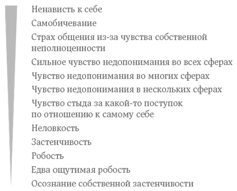 Стыд имеет несколько степеней (ниже приведена шкала). При худшем раскладе мы вовсе не испытываем эмпатии и настроены крайне негативно по отношению к самим себе. Наиболее слабая форма проявляется в кратковременном смущении или проявлении застенчивости. Также бывают случаи, когда вы не можете определить собственные ощущения, пока они полностью не исчезнут, или замечаете лишь, что стараетесь ни с кем не пересекаться взглядом.