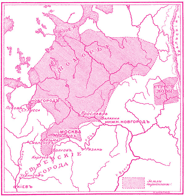 Опричнина и земщина. Опричнина, при первом взгляде на нее, особенно при таком поведении царя, представляется учреждением, лишенным всякого политического смысла. В самом деле, объявив в послании всех бояр изменниками и расхитителями земли, царь оставил управление землей в руках этих изменников и хищников. Но и у опричнины был свой смысл, хотя и довольно печальный. В ней надо различать территорию и цель. Слово «опричнина» в XVI в. было уже устарелым термином, который тогдашняя московская летопись перевела выражением «особной двор». Не царь Иван выдумал это слово, заимствованное из старого удельного языка. В удельное время так назывались особые выделенные владения, преимущественно те, которые отдавались в полную собственность княгиням-вдовам, в отличие от данных в пожизненное пользование, от прожитков. Опричнина царя Ивана была дворцовое хозяйственно-административное учреждение, заведовавшее землями, отведенными на содержание царского двора.