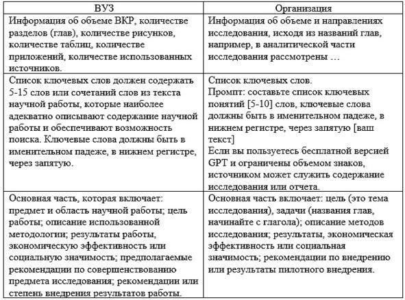 Структура аннотации или реферата для разных организаций приведена в табл. 1.