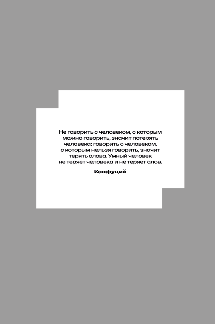 Эта книга — для тех, кто вступает в диалог каждый день. Для модераторов, журналистов, авторов подкастов и их гостей и слушателей, чтобы лучше понимать, что происходит во время любой беседы, и всех деловых людей. Потому что, независимо от того, стоит ли перед вами задача выйти на сцену, провести прямой эфир в зуме или вывести на нужную волну бизнес-партнера, вы ни за что не добьетесь своего, если не научитесь управлять диалогом и не зависеть при этом от внешних обстоятельств.