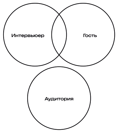 Интервьюер занимается только гостем и никогда не взаимодействует со зрительным залом напрямую. Он помнит о нем, работает для него, но законы жанра не позволяют залу ни во что вмешиваться открыто — только наблюдать. Тем сложнее и ответственнее работа интервьюера — это человек, управляющий невидимыми потоками взаимопонимания между тем, кто говорит, и теми, кто безмолвствует.