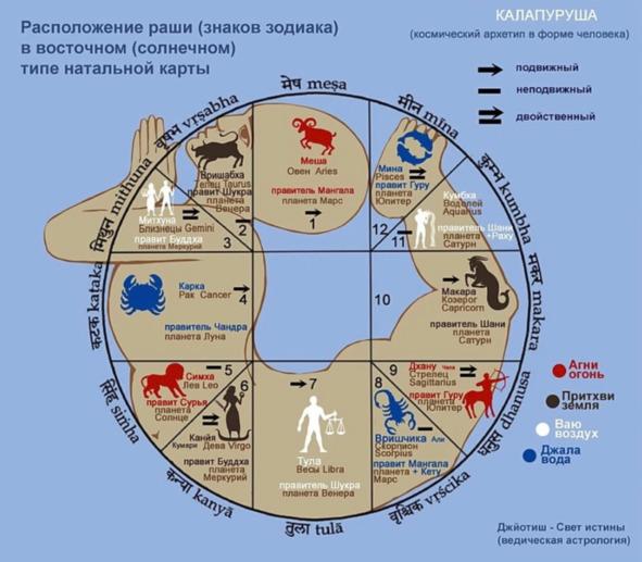 На рисунке 3 изображен вселенский человек Калапуруша. И здесь отчетливо видно, что первому дому гороскопа соответствует голова вселенского человека, второму — рот, третьему — руки и т. д.