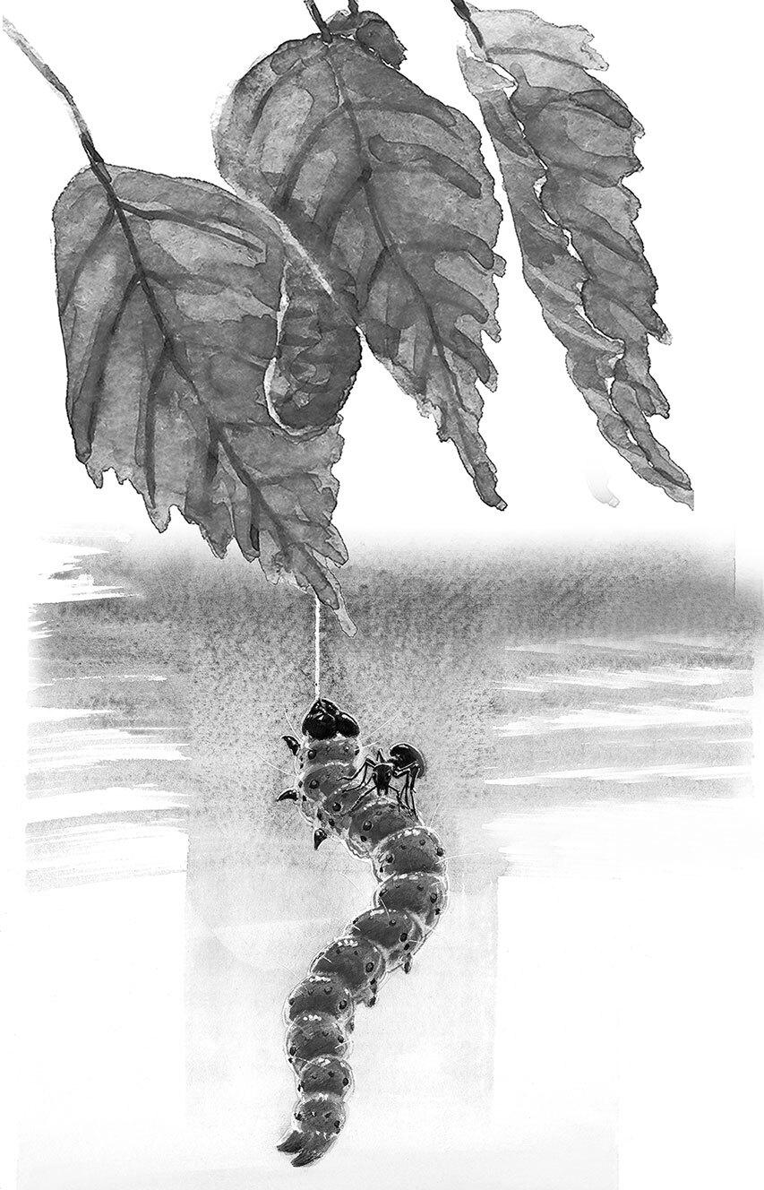 Вдруг видит: рядом на листке Гусеница-Листовёртка сидит, шёлковую нитку из себя тянет, тянет и на сучок мотает.