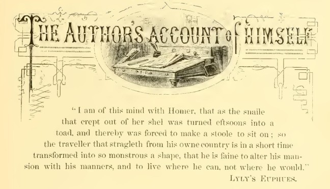 I am of this mind with Homer, that as the snaile that crept out of her shel was turned eftsoones into a toad I and thereby was forced to make a stoole to sit on; so the traveller that stragleth from his owne country is in a short time transformed into so monstrous a shape, that he is faine to alter his mansion with his manners, and to live where he can, not where he would. — LYLY’S EUPHUES.