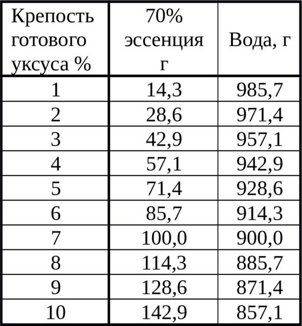 Таблица крепости уксуса