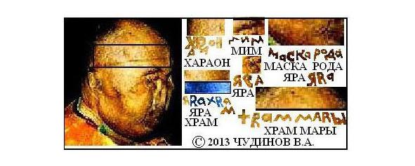 В. А. Чудинов [101]. В течение последних двух лет я с изумлением узнал о том, что на телах египетских мумий были нанесены русские надписи, в частности, слово ХАРАОН. Более того, аналогичные русские надписи, правда, без этого слова, оказались и на мощах христианских святых. Наконец, на теле мага Яромира удалось обнаружить надпись МАСКА РОДА, которая предположительно, означала, что человек ни жив, ни мертв, но находится в состоянии анабиоза. И у меня начало закрадываться смутное представление, что ни буряты, ни лица какого- либо другого этноса никаких надписей на теле покойного не делали.