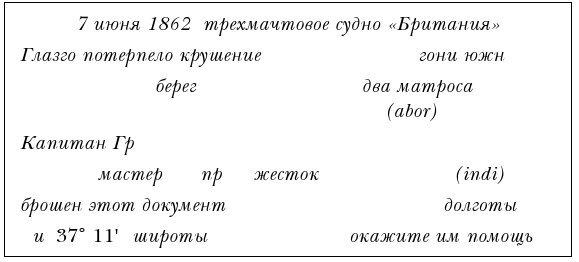 – В этом нет никакого сомнения, – отозвался Гленарван. – Слова sink, aland, that, and, lost уцелели; а skipp, очевидно, значит skipper. Видимо, речь тут идет о каком-то мистере Gr…, вероятно, капитане потерпевшего крушение судна.