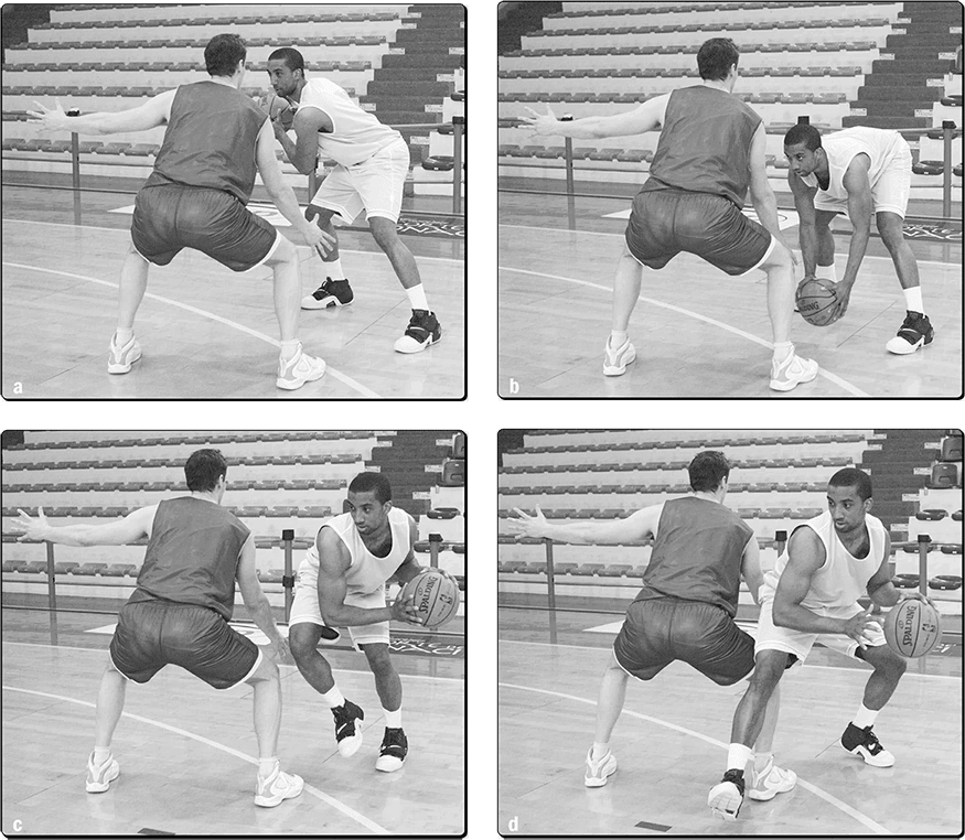 Работа ног. После перевода мяча переместите вес тела на подушку стопы вашей левой ноги и, поддерживая баланс, длинным шагом перешагните правой ногой переднюю ногу защитника, продвигаясь вперед на левой ноге, одновременно выполняя размашистый удар мячом в пол левой рукой. Шаг должен быть длинным, но без нарушения баланса и контроля (рис. 2.1c). Первый шаг должен совпадать со сменой темпа игры.