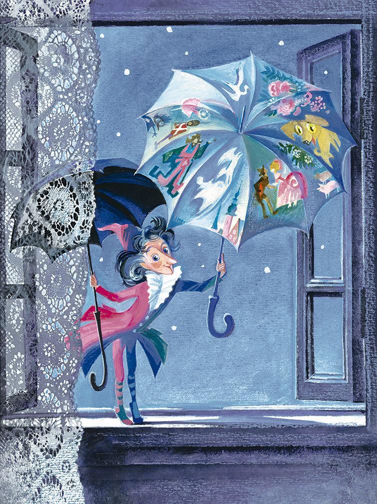 Но вот де́ти засну́ли, и О́ле-Луко́йе приса́живается на край крова́тки. Оде́т он преле́стно – в шёлковый кафта́н; то́лько нельзя́ сказа́ть, како́го цве́та э́тот кафта́н: он отлива́ет то си́ним, то зелёным, то кра́сным, смотря́ куда́ повернётся О́ле. Под мы́шкой он де́ржит два зо́нтика. Оди́н зо́нтик – тот, что с карти́нками, – О́ле раскрыва́ет над хоро́шими детьми́; и им тогда́ всю ночь сня́тся увлека́тельные ска́зки. Друго́й зо́нтик – совсе́м просто́й, гла́дкий, и О́ле раскрыва́ет его́ над озорны́ми детьми́; ну они́ и спят как чурбаны́ всю ночь, а у́тром ока́зывается, что они́ ро́вно ничего́ не ви́дели во сне!